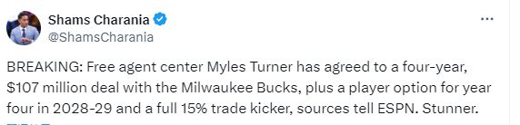 北京时间7月1日,据名记Shams报道,自由球员中锋迈尔斯-特纳已经与雄鹿达成一份4年1.07亿美元的协议,其中包括第四年的球员选项以及15%的交易保证金。